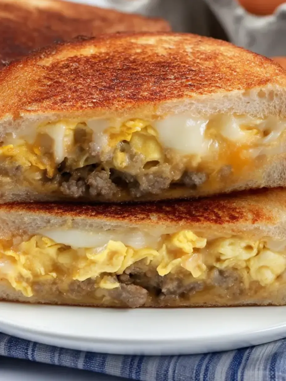 Dieses deftige Frühstücks-Käsesandwich verwandelt deine Morgenroutine mit einer perfekten Mischung aus Rühreiern, schmelzendem Käse und würziger Frühstückswurst, alles zwischen goldbraunem, butterigem Sauerteigbrot. Es macht aus dem klassischen Käsesandwich ein nahrhaftes Frühstück, das dich durch den Tag bringt.